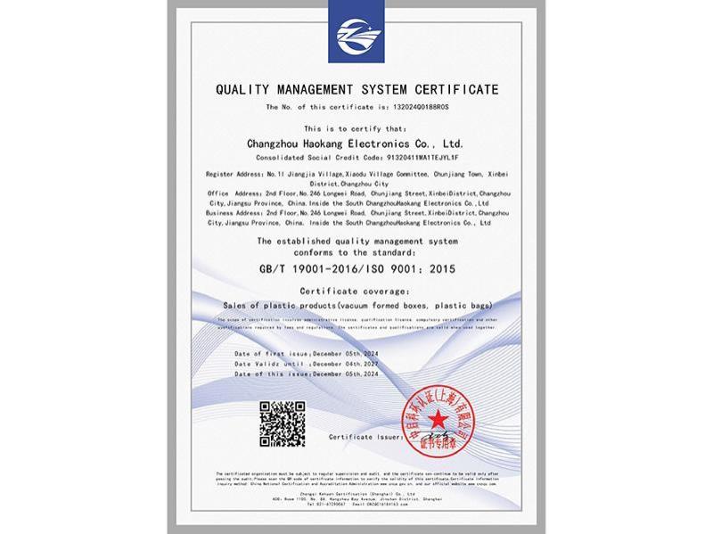 Changzhou Haokang Electronics Co., Ltd. is a one-stop packaging service enterprise that integrates blister packaging. Established in 2007, Changzhou Haokang Electronics has successively set up manufacturing plants in Xinbei District and Wujin District of Changzhou City. With strong capabilities in packaging products, the company has been providing high-quality products and services to various partners for many years, becoming a comprehensive professional service provider in the packaging industry. We possess specialized production equipment and testing instruments, ensuring rapid and assured production processes from raw material screening and inspection to full monitoring of the production process. Haokang is committed to providing customers with assured packaging.